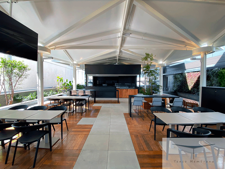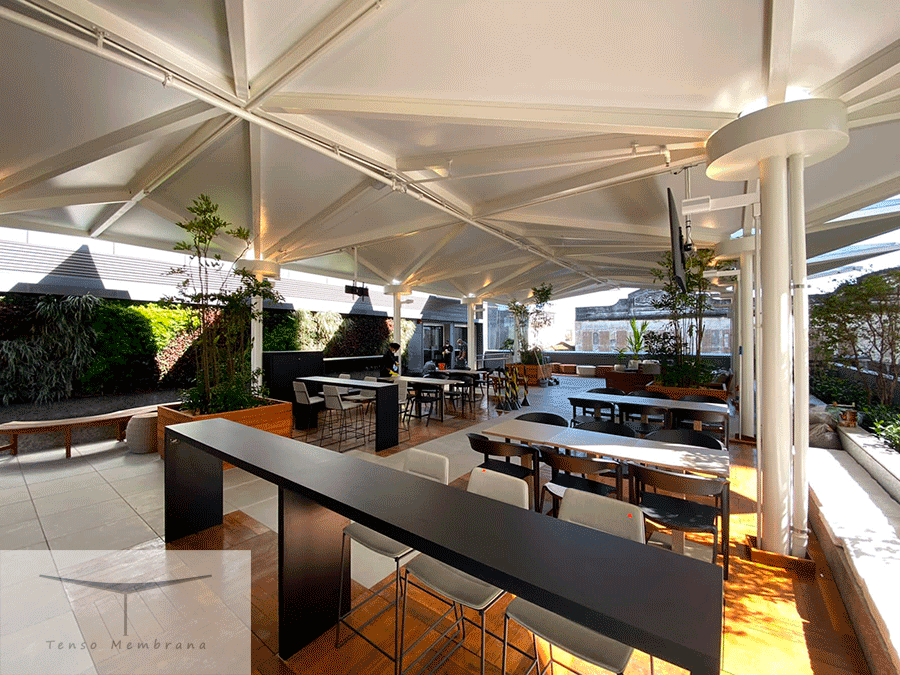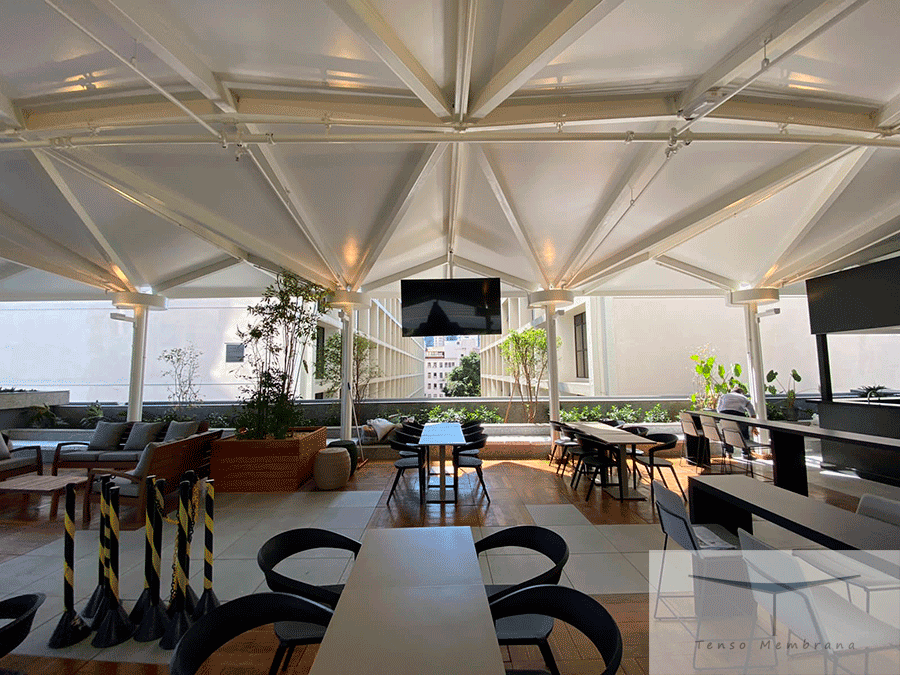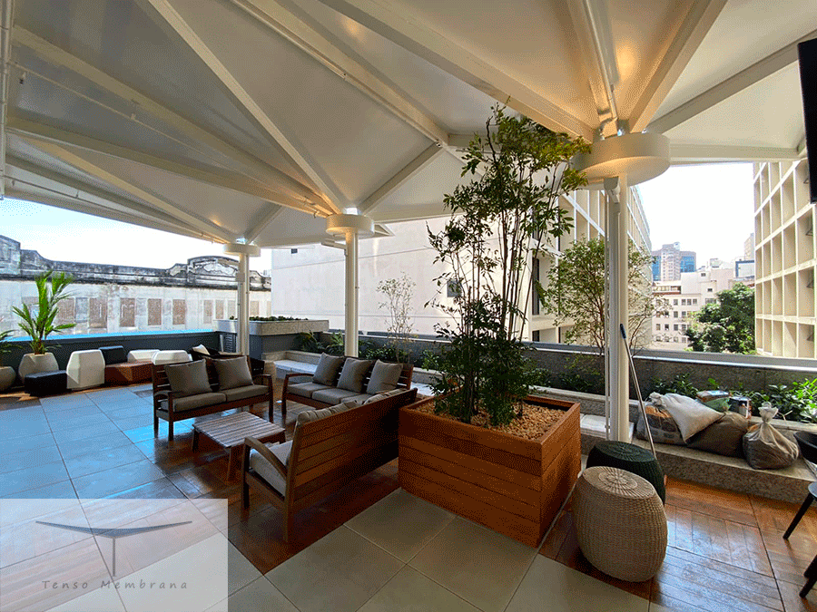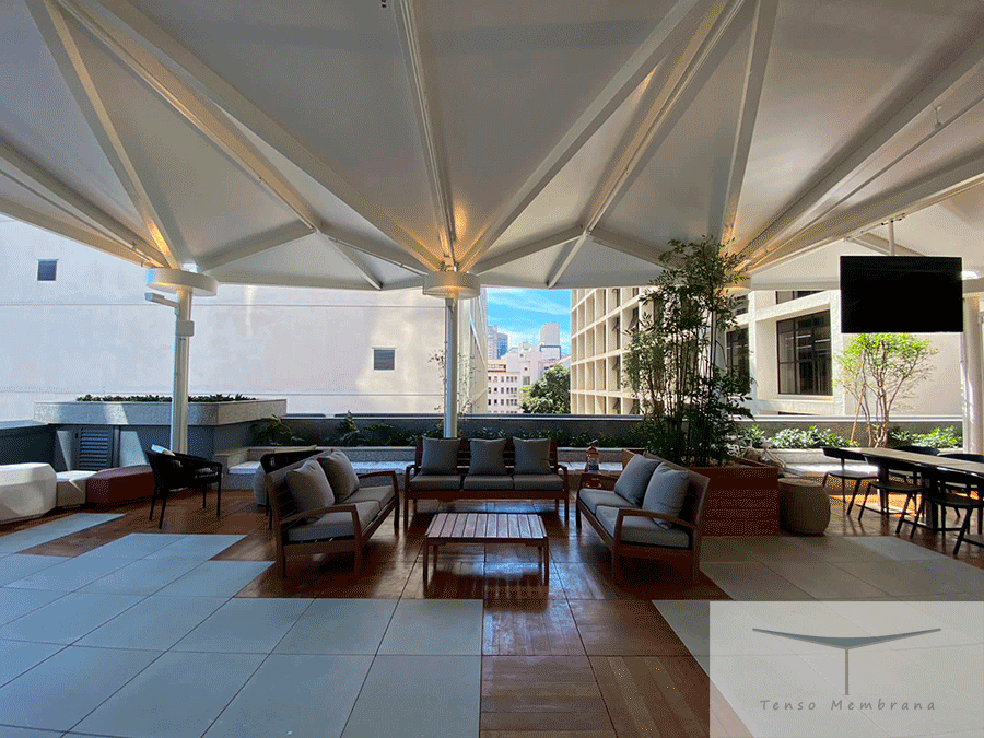 Cobertura tensionada no terraço do 4º andar da L’Oréal (RJ), garantindo sombreamento, conforto e amplo vão livre.