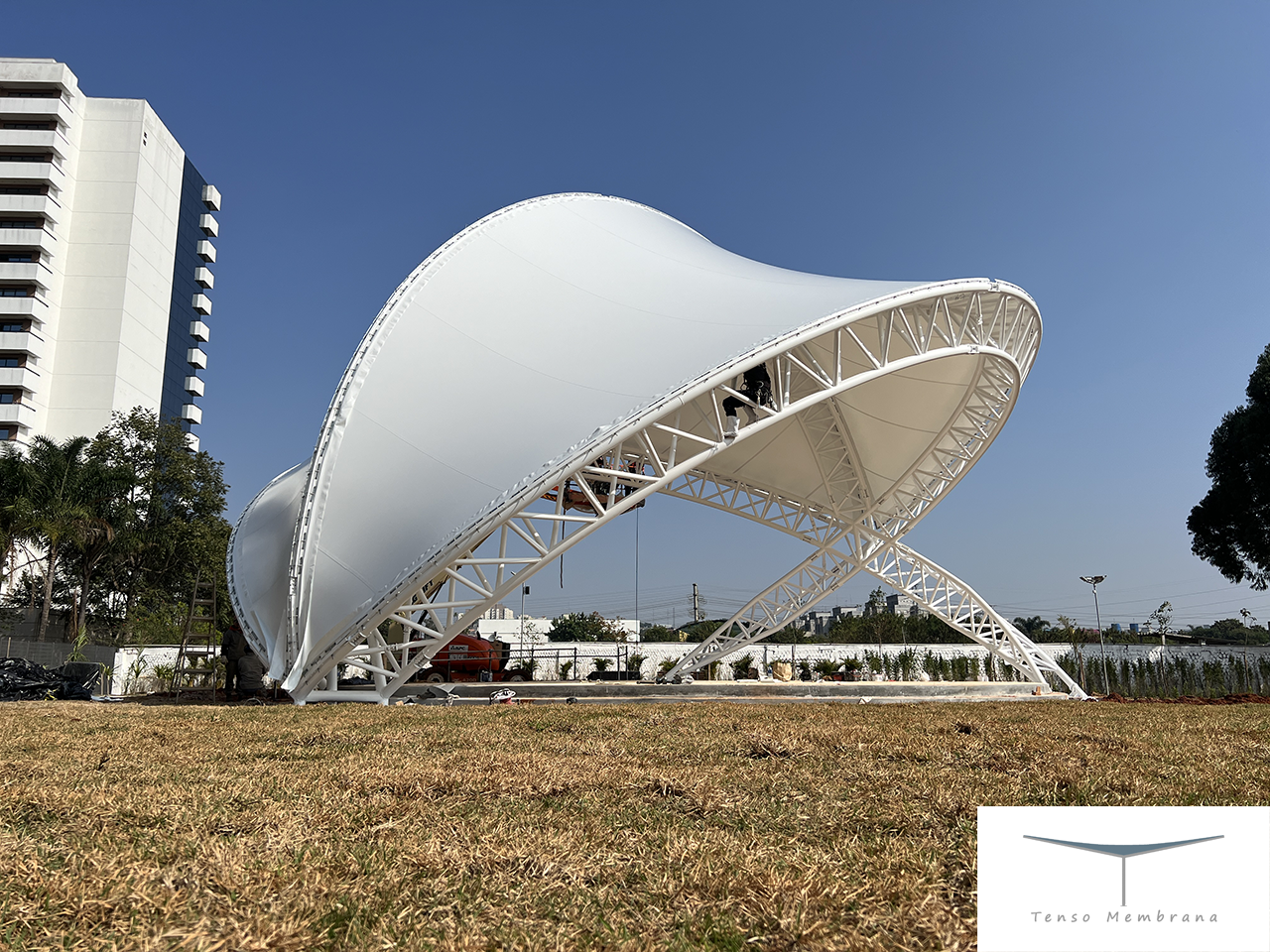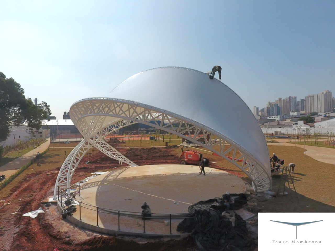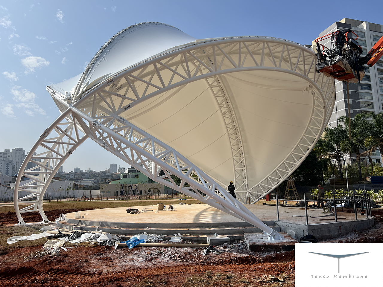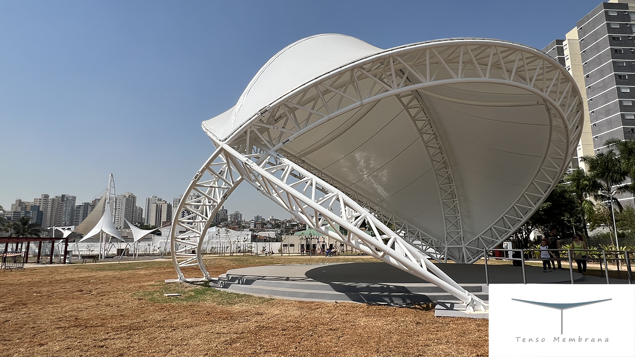 Cobertura tensionada executada no novo Parque Elis Regina, em São Caetano do Sul (SP), combinando proteção, design inovador e amplo vão livre para eventos e apresentações.