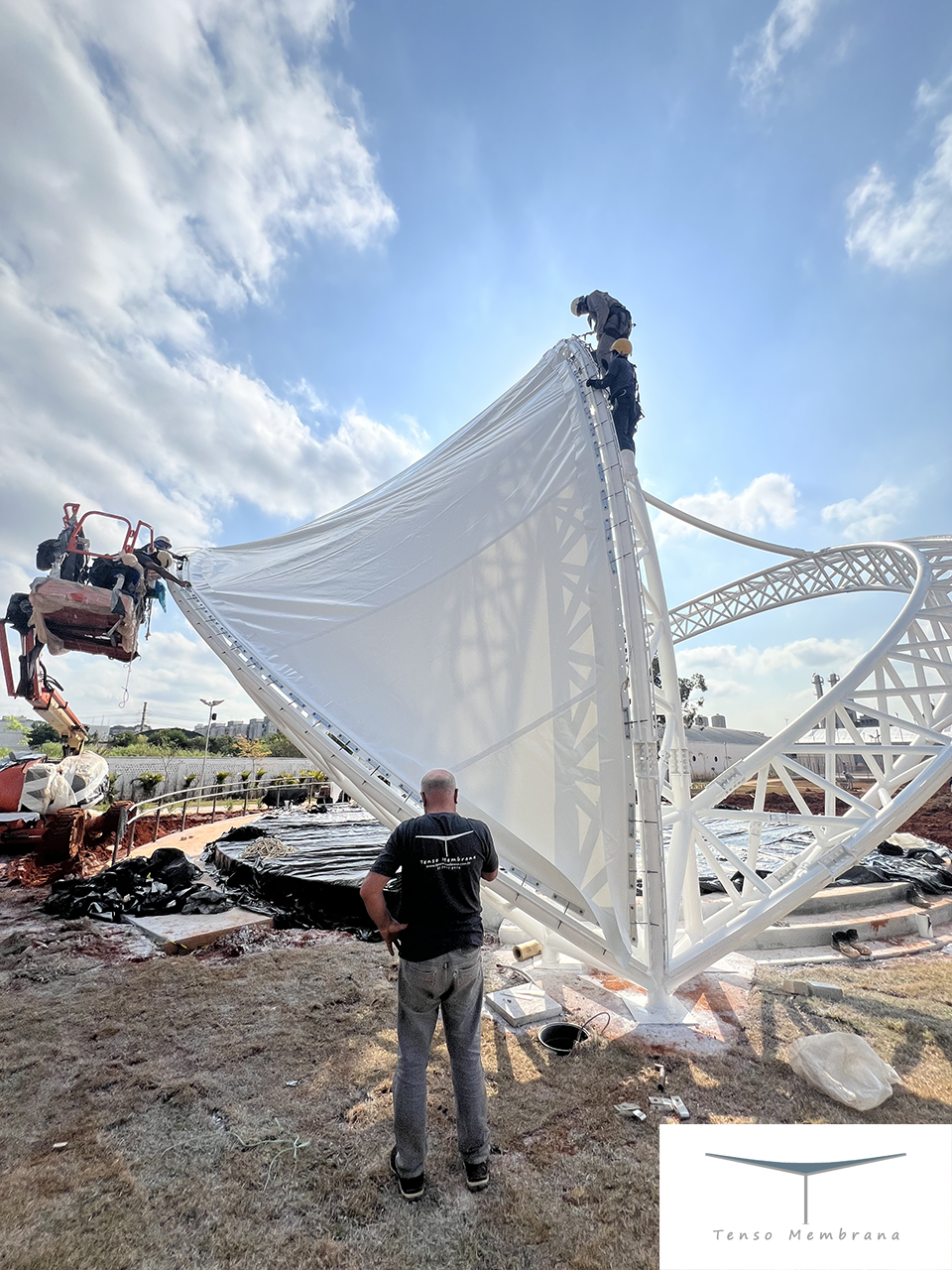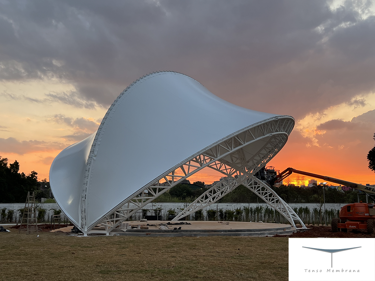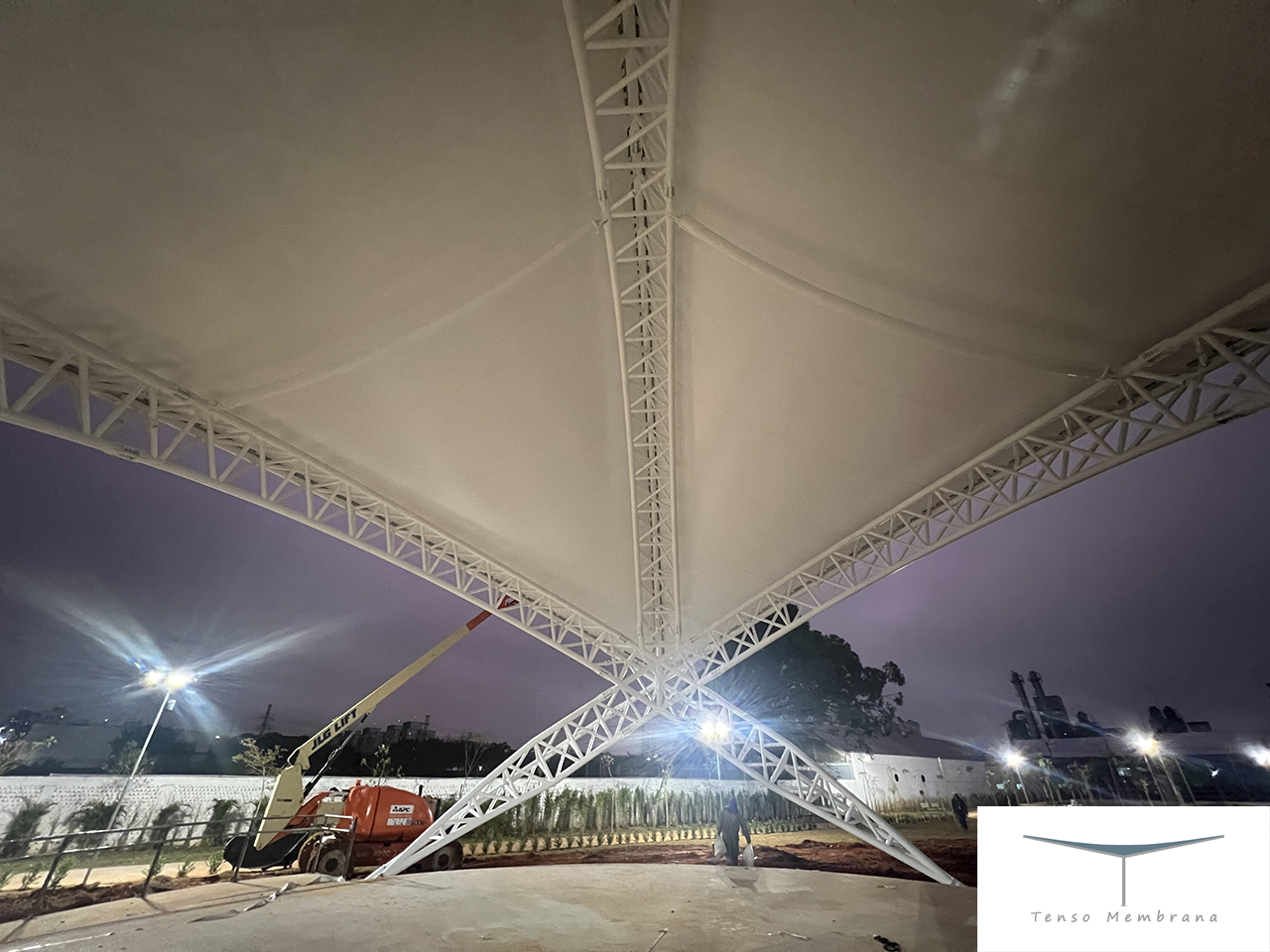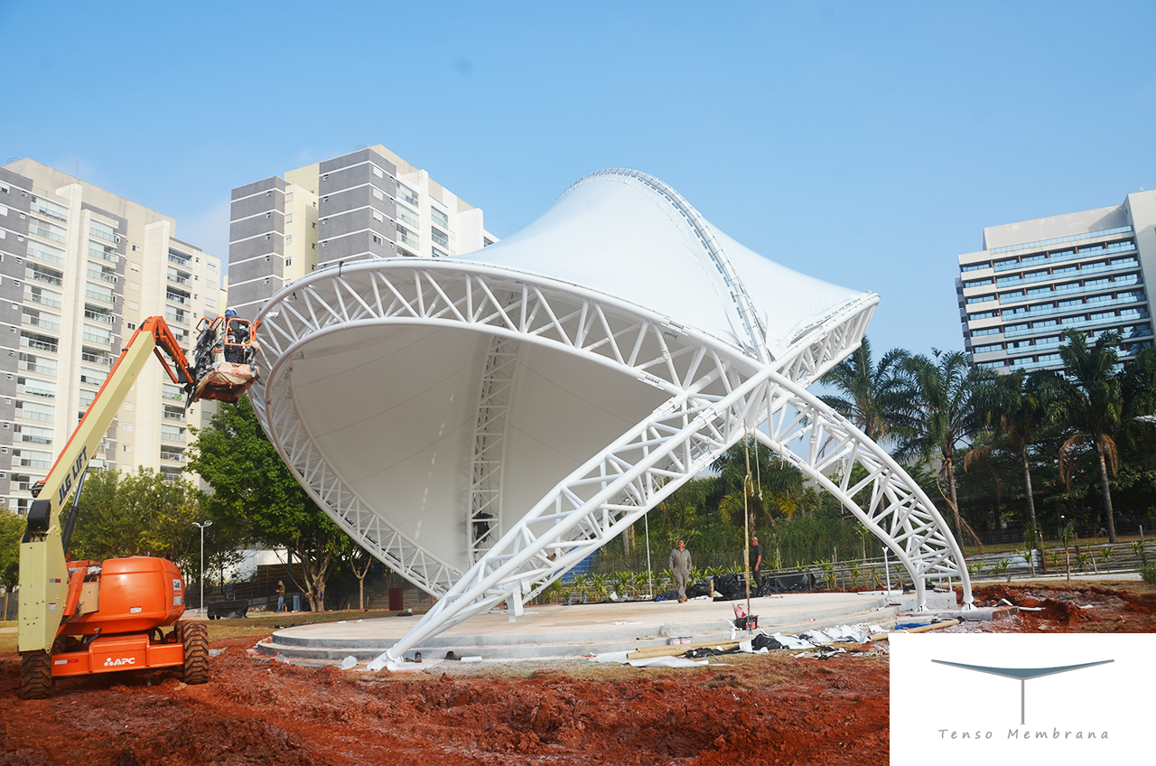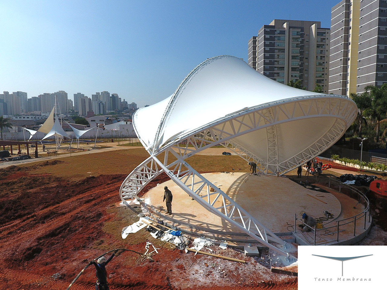 Cobertura tensionada executada no novo Parque Elis Regina, em São Caetano do Sul (SP), combinando proteção, design inovador e amplo vão livre para eventos e apresentações.