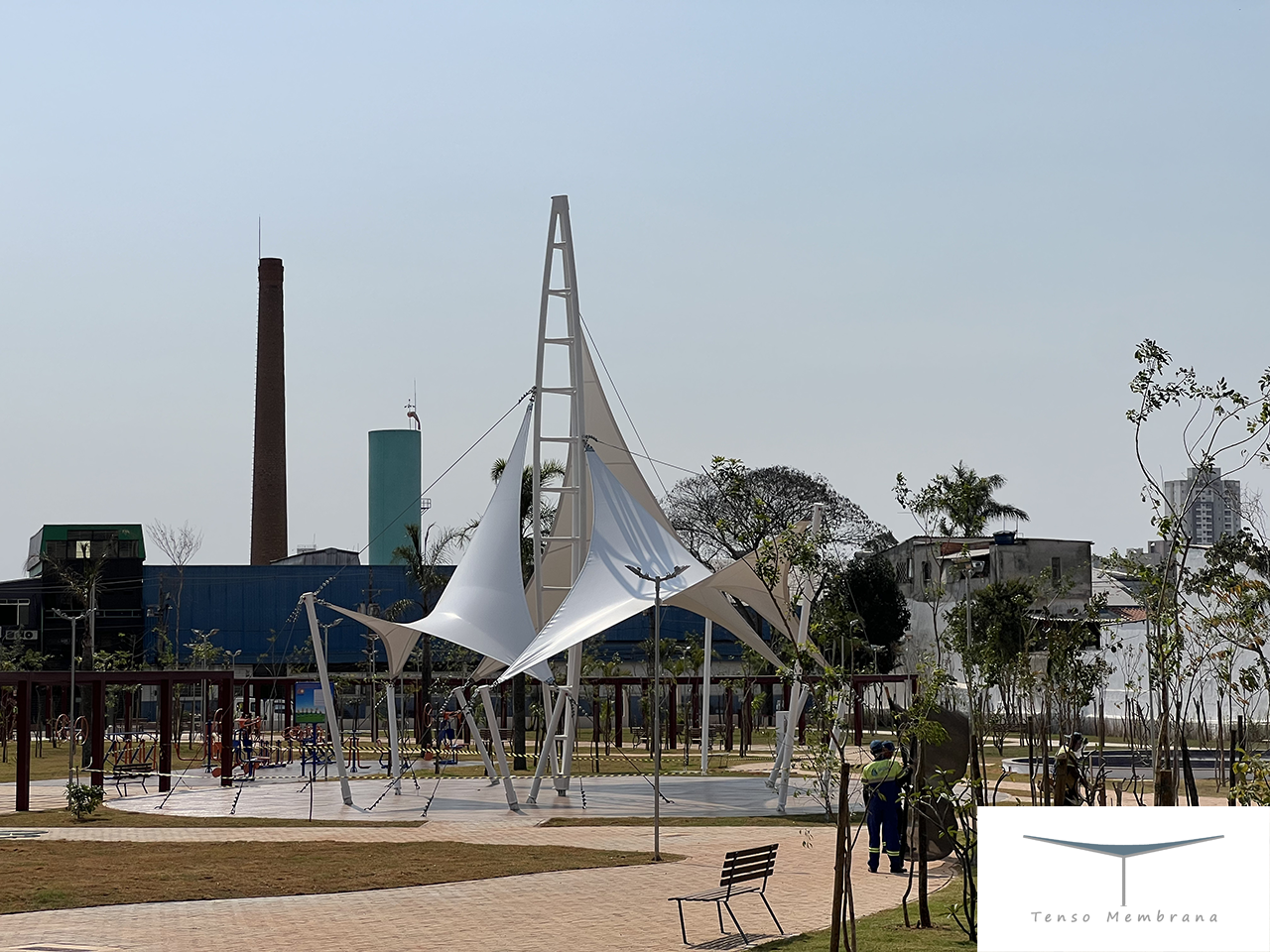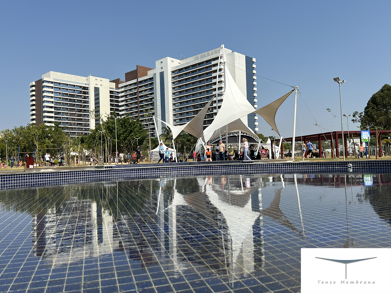 Cobertura tensionada localizada em área central do Parque Elis Regina, funcionando como ponto de encontro e oferecendo sombra agradável para os frequentadores ao longo do dia.